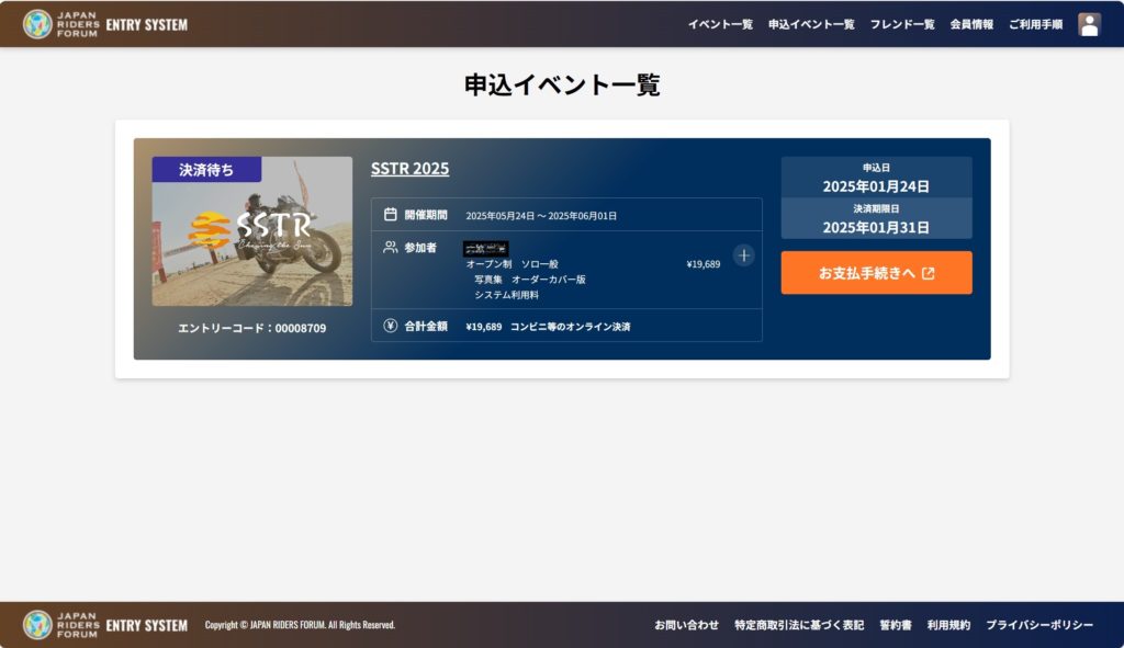 「件名: [JRF-ENTRY]エントリー受付通知(オンライン決済)」メールが日本ライダーズフォーラム(no-reply@jrf-entry.world)から届きますので、メールに記載されている決済期限までに必ずお支払い手続きをお願いします。
