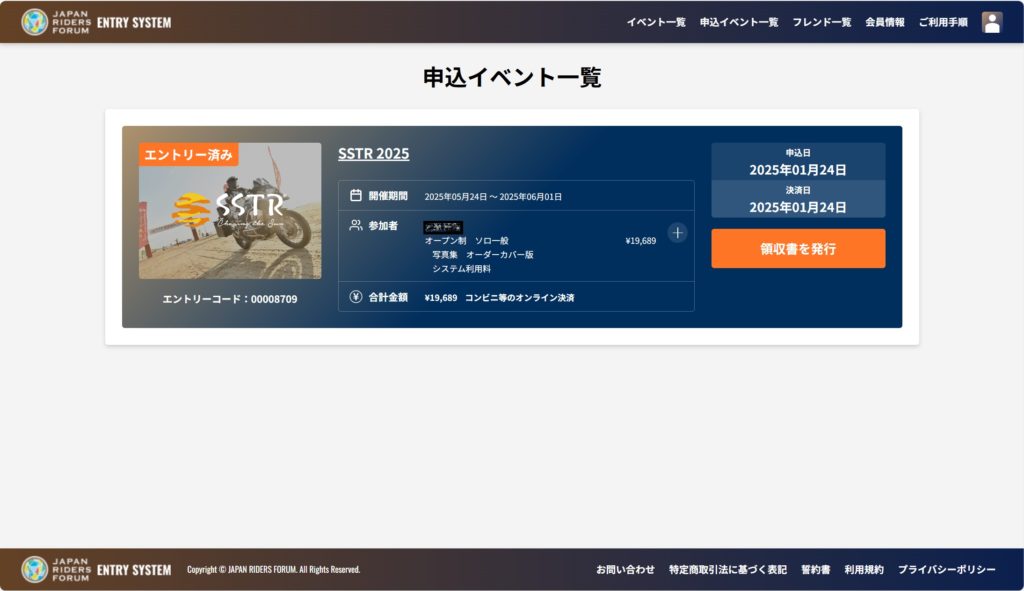 決済手続きが完了すると、「申込イベント一覧」に「エントリー済み」と表示され、以下のようなエントリー受付通知メールが日本ライダーズフォーラム(no-reply@jrf-entry.world)から届き、エントリー完了です。