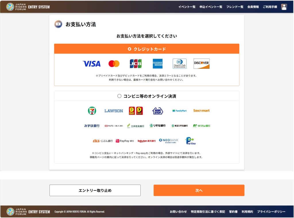 参加者の入力情報の確認を完了すると、お支払い方法の選択画面へ進みます。