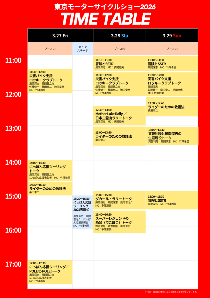 また、ブース内では「冒険」をテーマにしたセッションのほか、今年本格始動する災害バイク支援プログラム「ロッキークラブ」、さらに「にっぽん応援ツーリング」や「POLE to POLE」といった関連イベントに関するトークショーも多数開催しております。